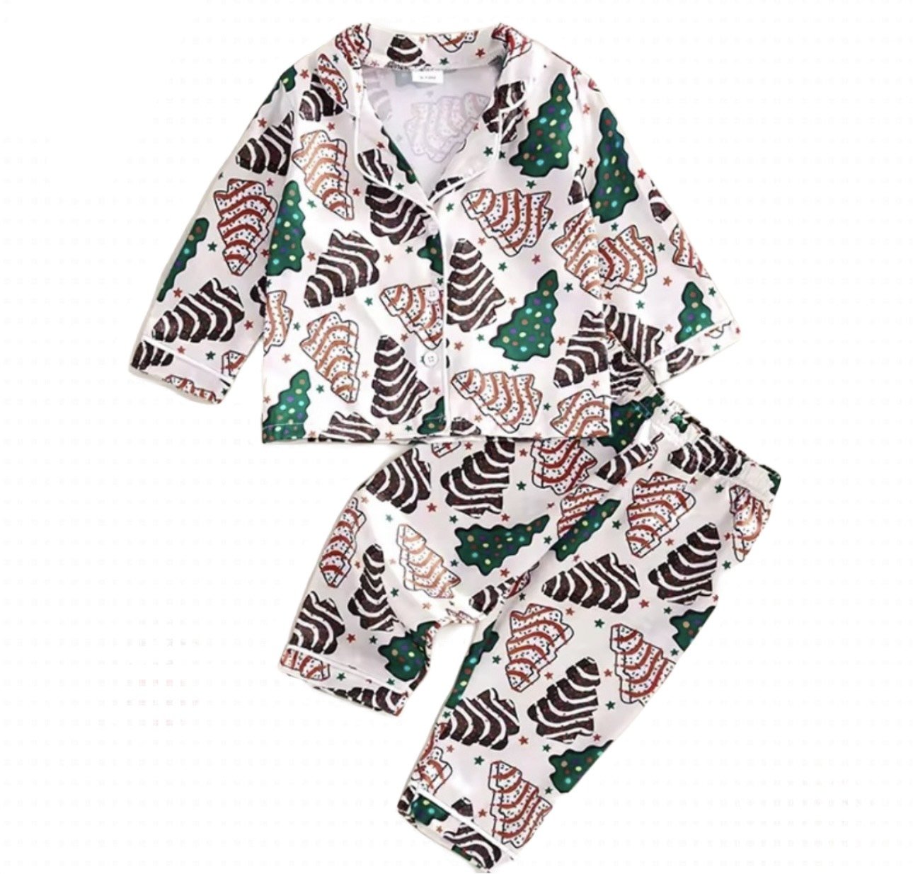 Christmas Tree Cakes printed satin button front pajamas. Available in toddler sizes