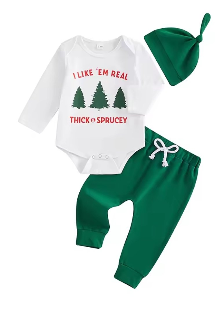 I Like Em Real Thick & Sprucey Three piece set includes long sleeve bodyuit with coordinating knit joggers and cap